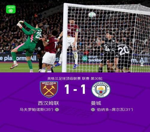 北京时间3月15日英格兰足球顶级联赛 联赛 第30轮,西汉姆联主场对阵曼城。上半场B席吊射破门,马夫罗帕诺斯头球扳平,下半场哈兰德失良机,赖因德斯中框,最终比分西汉姆联 1-1 曼城。