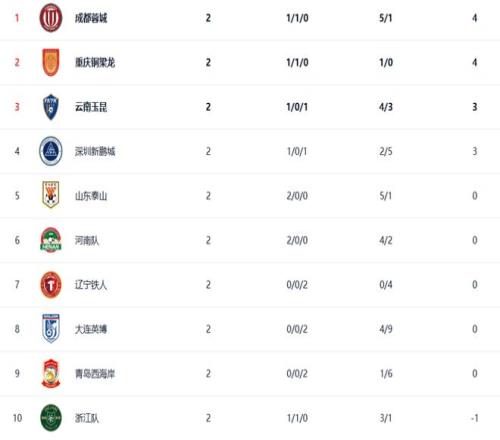 云南玉昆、深圳新鹏城同积3分,分别排名第3、4位,山东泰山排名第5位。前两战一平一负的青岛海牛(-6分)、天津津门虎(-9分)分居后两位,一胜一平的上海申花则以-6的积分排名第14位。