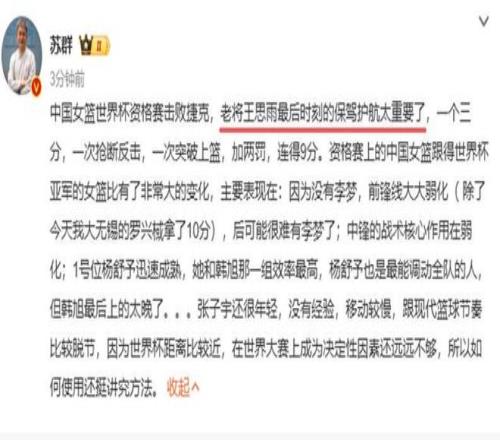 王思雨末节9分,充分展现了自己的能力,名嘴苏群大夸:老将王思雨最后时刻的保驾护航太重要了。全场7投5中,还有3次助攻,再次拿到全队最高的14分,不得不说美女王思雨是中国队最大的功臣。上一场与南苏丹的比赛,也是王思雨砍下全队最高的17分,她是这次世预赛贡献最大的队员。