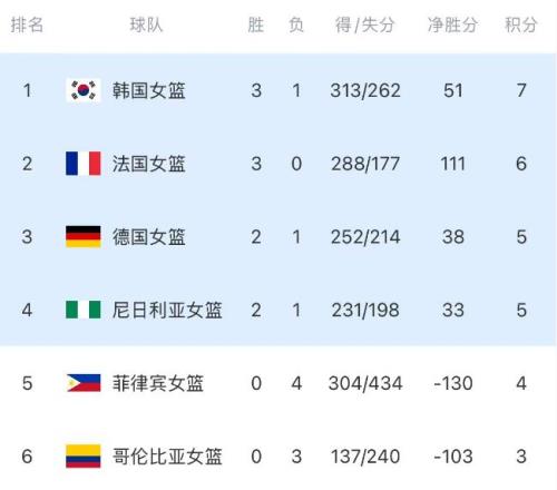 随着韩国队31分大胜,中国女篮10分小胜,世预赛最新积分形势也已经出炉。