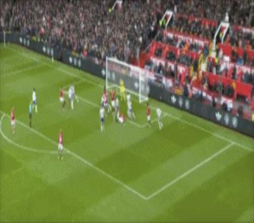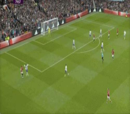 第43分钟,曼联反击,B费左路内切,禁区外右脚远射打偏。