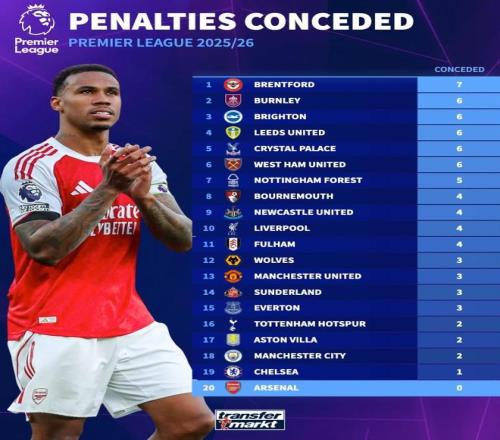 北京时间3月17日,德转统计出了本赛季至今英超联赛点球丢球排行榜,布伦特福德7次点球丢分所有球队最多,领头羊阿森纳则是唯一一支尚未因为点球丢分的球队。