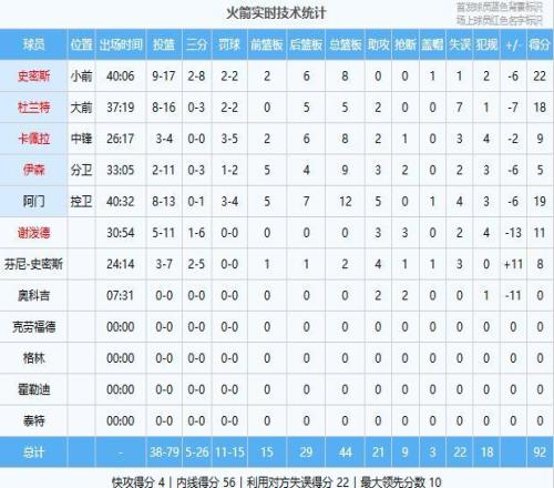 史密斯22分8板、阿门19分12板5助、杜兰特18分5板2助、谢泼德11分3助3断、卡佩拉9分8板2助、芬尼-史密斯8分2板4助、伊森5分9板3助2断、奥科吉2助2断