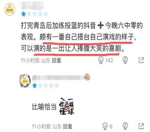 他自作自受的糟糕表现,也引起了球迷的热议:“继续玩梗啊,作为队长,赛前如此傲慢的态度不输球才怪,丢人现眼”、“加练投篮的抖音+6中0的表现,颇有一番自己搭台自己演戏的样子,可惜演的是一出让人捧腹大笑的喜剧”。
