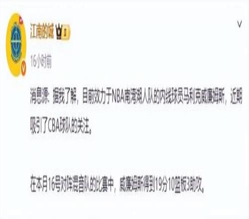 其实在之前的窗口期里,广东男篮也一直在寻找新的大外援人选,而朱芳雨在球迷群里的一句“新外援在路上”,更是让广东球迷充满期待,但随后却没有了相关消息。就在日前,媒体人“江南的城”透露,在NBA发展联盟征战的大外援马利克-威廉姆斯,引起了CBA球队的关注。