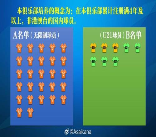剩余名额须为本俱乐部培养的U21球员(指在国内球员中,非港澳台身份,且在本俱乐部累计注册满4年或以上)。