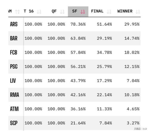 巴萨进入欧冠四强的几率高达63.48%,可见大数据是有多不看好马竞了。阿森纳则更轻松,淘汰葡萄牙体育的几率为78.36%。