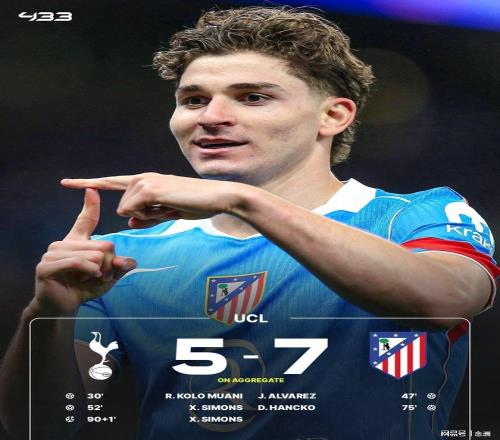 马竞客场2-3负于热刺,但仍以总比分7-5晋级欧冠八强。卢克曼进球因越位被吹掉,穆阿尼头球破门打破僵局,卢克曼反击助攻阿尔瓦雷斯破门,哈维-西蒙斯回敬远射,汉茨科头球再度扳平比分,哈维-西蒙斯在比赛尾声阶段造点并主罚命中。