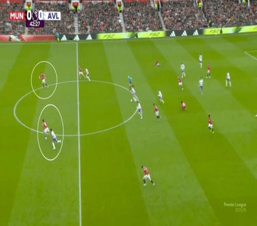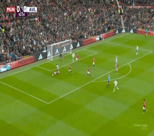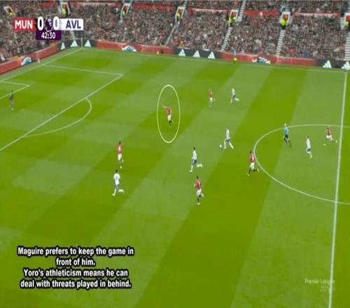 在曼联客场3-1击败阿斯顿维拉的比赛中,约罗全方位展现了身为顶级后卫的亮眼特质。上半场临近尾声阶段,维拉在中场中路完成断球反击,瞬间打破曼联中场控球节奏,迫使约罗与搭档哈里-马奎尔同步回撤落位。