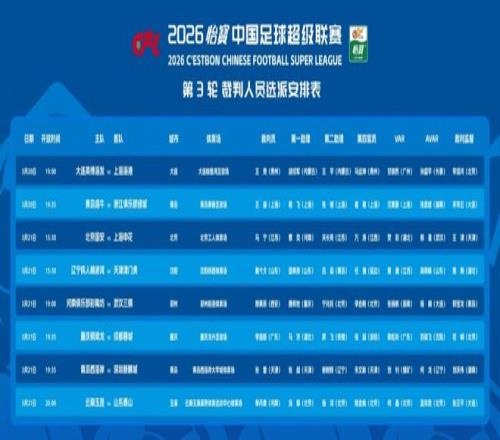 此外,李海新则成为“成渝”德比的主裁,他将执法重庆铜梁龙主场与成都蓉城的“榜首大战”。值得注意的是,另外两大名哨麦麦提江和唐顺齐,则无缘本轮中超执法,疑似遭到了足协内部“禁哨”的处罚。