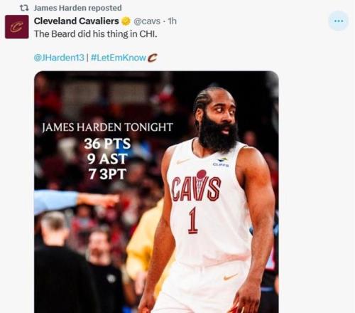 因此哈登也成为骑士队赢球封面人物,骑士官方赛后专门发文称赞到:“大胡子在芝加哥大显身手。”