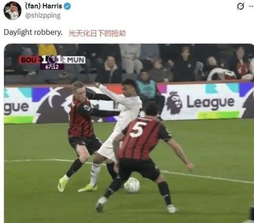 第68分钟,曼联边锋迪亚洛突入禁区,被伯恩茅斯后卫特吕费尔从身后明显拉拽后倒地。慢镜头显示,拉人动作清晰,重心失衡明显。但主裁毫不犹豫示意比赛继续,VAR也未介入。赛后英超官方轻描淡写解释:“动作不足以构成犯规”。