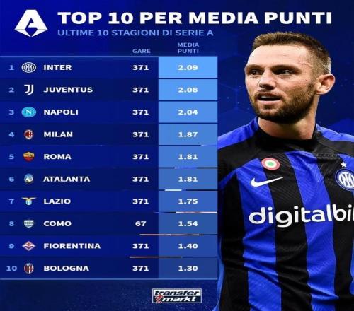意甲近10年场均积分排名TOP10: