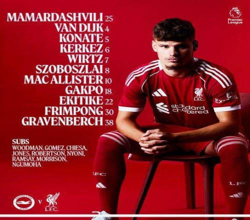 英超第31轮,利物浦客战布莱顿。阿利松、萨拉赫伤缺,索博斯洛伊、维尔茨领衔,埃基蒂克突前,恩古莫哈替补。