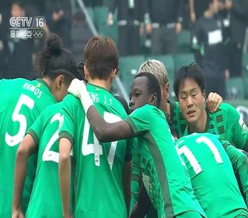 北京国安首发:39-张健智、5-拉莫斯(F)、24-阿不都海米提、47-邓捷夫、8-孔特(F)、10-张稀哲、20-恩科洛洛(F)、36-贾非凡、9-张玉宁、11-林良铭、29-法比奥(F)