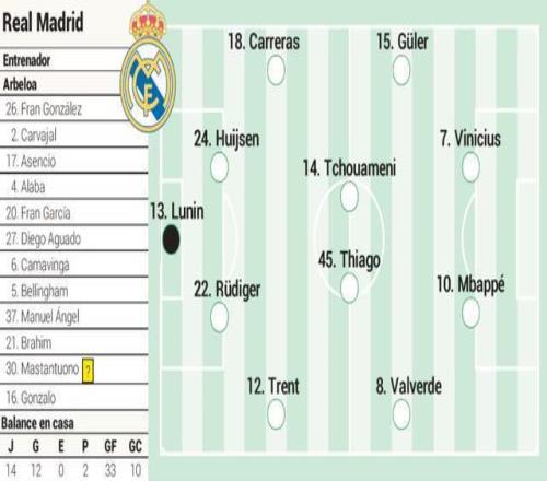 皇马预计首发十一人: 卢宁 / 特伦特、吕迪格、怀森、卡雷拉斯 / 巴尔韦德、蒂亚戈、楚阿梅尼、居莱尔 / 姆巴佩、维尼修斯