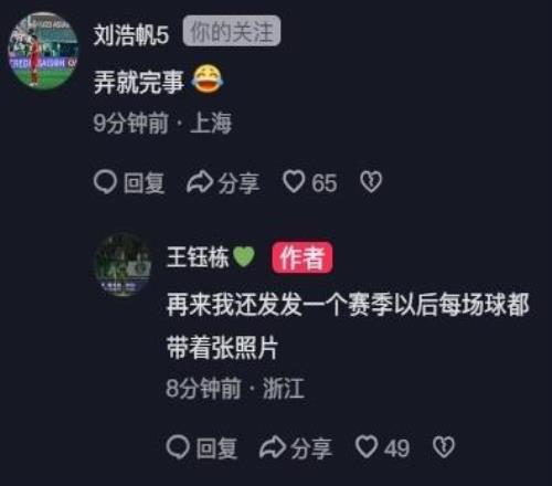 而U23国足的队友刘浩帆也在评论区力挺王钰栋:“弄就完事!”王钰栋则回复道:“再来(举报的话)我还发,发一个赛季,每场球都带着这张照片!”