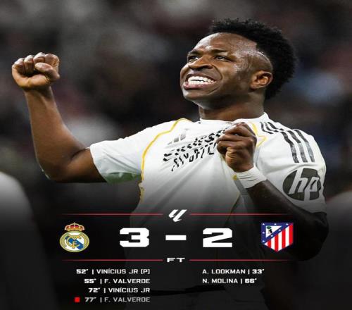 第77分钟,巴尔韦德战术犯规被直接红牌罚下,马竞看到了翻盘的希望,随后大举压上疯狂进攻。最后十多分钟,皇马10人死守,卢宁、吕迪格与姆巴佩的连续解围才把3-2的比分守到终场。复仇成功的皇马拿下各项赛事五连胜,继续对巴萨施加压力。
