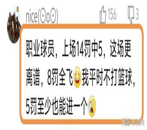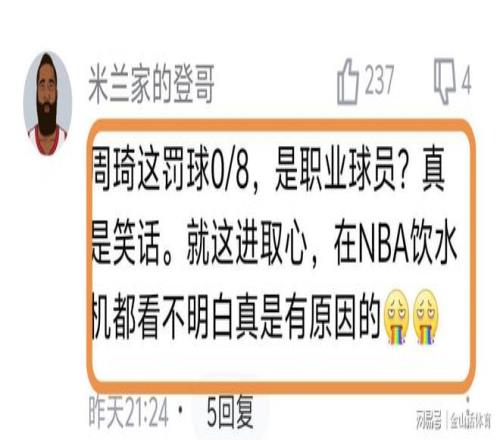 “周琦这罚球0/8,是职业球员?真是笑话。就这进取心,在NBA饮水机都看不明白真是有原因的。”;“职业球员,上场14罚中5,这场更离谱,8罚全飞,我平时不打篮球,5罚至少也能进一个”“8中0,和街溜子有啥区别?”……