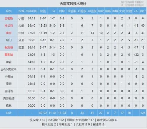杜兰特出战39分32秒,投篮22中15,三分9中5,罚球8中5,得到40分7篮板5助攻4失误,正负值-18全场最低。申京19投16中,得到33分13篮板10助攻2抢断2盖帽,正负值-6。杜兰特、申京、阿门合计54中39得到96分,其余队友38中10仅得28分。