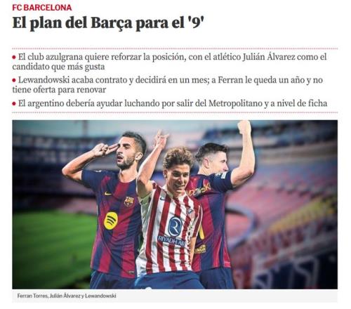 巴萨非常欣赏阿尔瓦雷斯,阿根廷中锋有技术,能回撤串联,具备持球、突破的能力,既能与两翼的亚马尔、拉菲尼亚连线,也可以和佩德里、费尔明合作。《世界体育报》表示,巴萨意识到,球队必须增强9号的实力,“小蜘蛛”是不二人选。