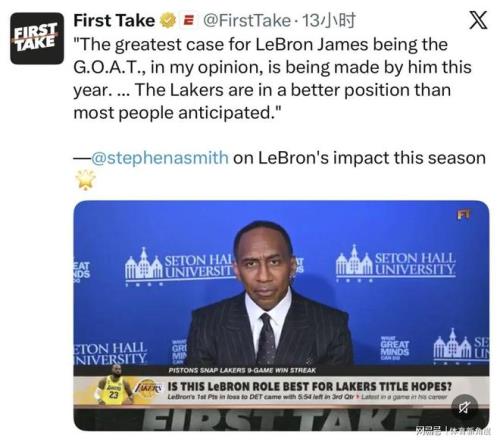 这不禁让人疑惑,史蒂芬·A·史密斯是否真的被近期詹姆斯的卓越表现所折服?毕竟,他曾信誓旦旦地表示,这辈子都不会再喜欢詹姆斯,甚至在去年8月还放言:“即便余生都不再与詹姆斯交谈,对我而言也毫无影响。”