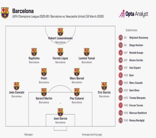 欧冠1/8决赛次回合,巴塞罗那主场对阵纽卡斯尔联,此役巴萨首发平均年龄为25岁18天,这是巴萨队史欧冠淘汰赛最年...