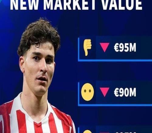 3月14日,德国转会市场网站官方预热马竞前锋阿尔瓦雷斯身价更新,这位阿根廷前锋身价将会被下调,最高降至9500万...