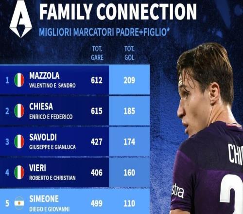意甲历史父子进球榜:基耶萨父子第2,西蒙尼父子第5