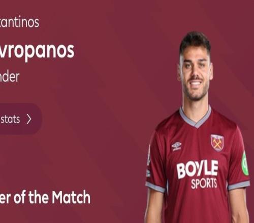 头球破门+10次解围,马夫罗帕诺斯当选西汉姆11曼城全场最佳