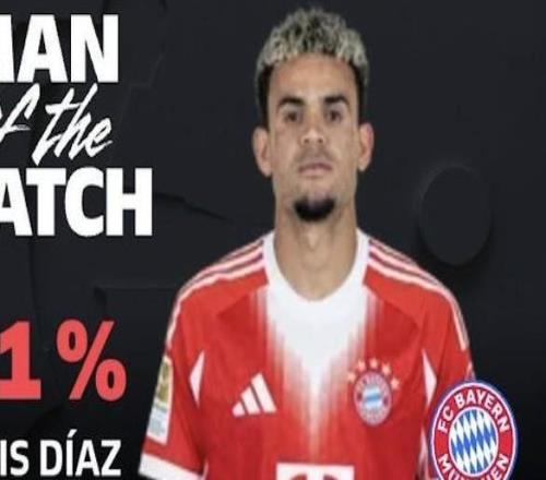 德甲第26轮,拜仁慕尼黑客场1-1战平勒沃库森,此役打入一球后染红离场的路易斯-迪亚斯当选德甲官方全场最佳球员...