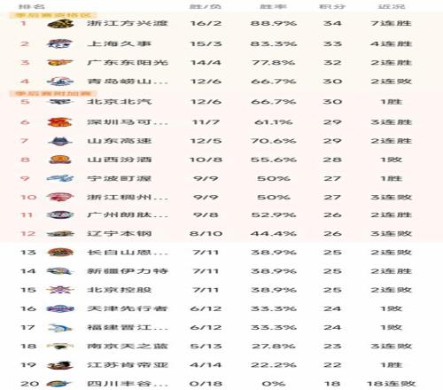北京时间1月23日,今晚的CBA常规赛继续进行,第18轮结束了最后4场对决,我们看看积分榜的变动,主要的信息如下:上海110-80大胜福建稳居第二,辽宁79-84不敌山东,广州112-102加时险胜南京,宁波82-68战胜青岛!