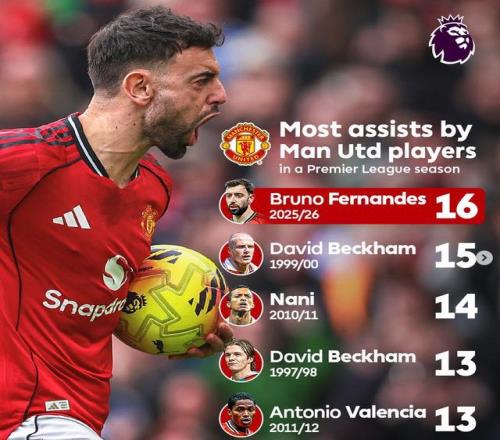 北京时间3月15日22点,25-26赛季英超第30轮曼联3-1力克阿斯顿维拉,布鲁诺-费尔南德斯送出两记关键助攻,斩获本赛季英超16次助攻,打破了由小贝保持26年的曼联队史单赛季英超助攻纪录!
