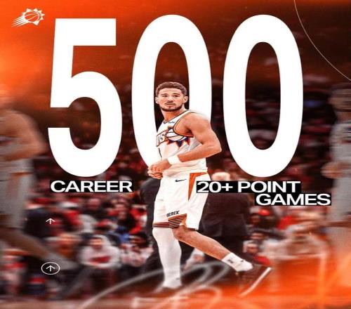 布克达成NBA生涯500场得分20+里程碑。