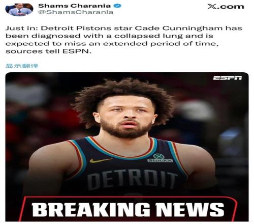 爆料王Shams:坎宁安被诊断出患有气胸(肺部塌陷),预计将缺席很长一段时间。