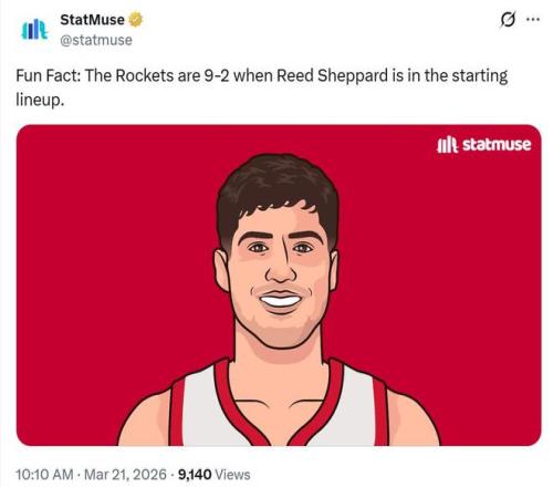 本场比赛取胜后,本赛季当谢泼德首发时,火箭队拿下11战9胜傲人表现,效果可谓是立竿见影,这套首发本场一共打了9分钟,期间火箭进攻效率120,防守效率100,净效率为夸张的+20。